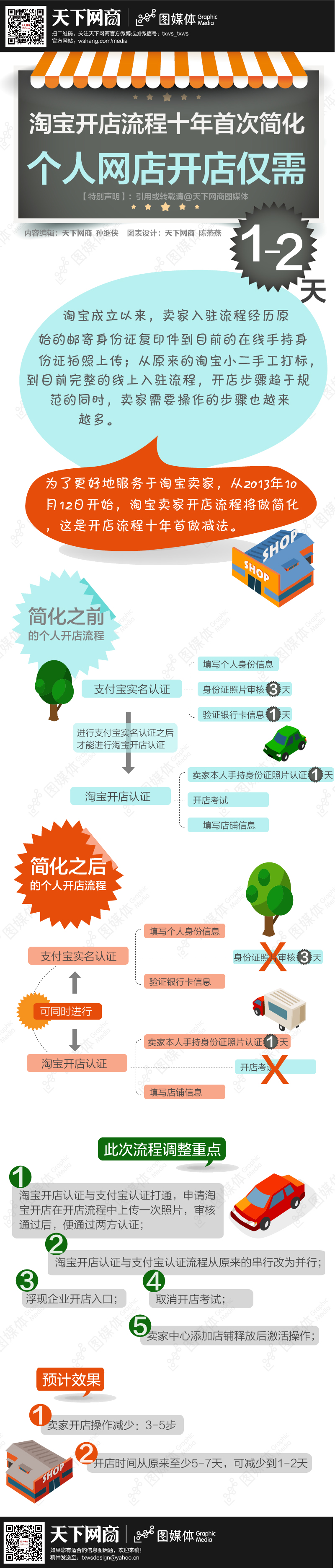 淘宝成立以来,卖家入驻流程经历原始的邮寄身份证复印件到目前的在线手持身份证拍照上传;从原来的淘宝小二手工打标,到目前完整的线上入驻流程,开店步骤趋于规范的同时,卖家需要操作的步骤也越来越多。为了更好地服务于淘宝卖家,从2013年10月12日开始,淘宝卖家开店流程将做简化,这是开店流程十年首做减法。