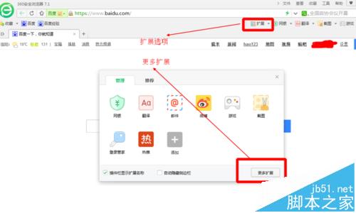 1、下载360游览器 2、安装完之后,打开360浏览器,如图找到扩展按钮!鼠标左键打开,在弹出的页面中找到【更多扩展】,鼠标选中左键点击打开