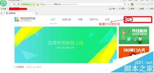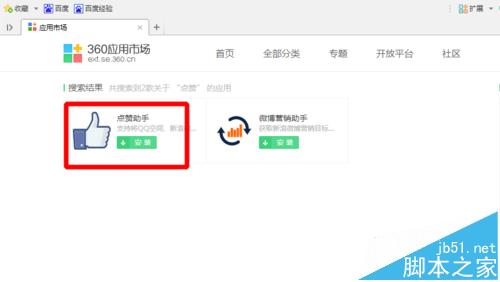 3、打开更多扩展,进入360的应用市场,如图找到搜索框,输入关键字【点赞】,点击搜索